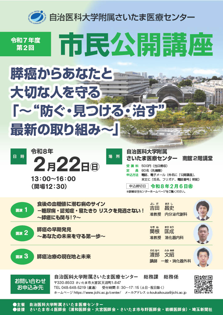 | お申し込み先 | 〒330-8503 さいたま市大宮区天沼町1-847 自治医科大学附属さいたま医療センター 総務課 総務係 TEL:048-648-5219 E-mail:o-koukaikouza@jichi.ac.jp |