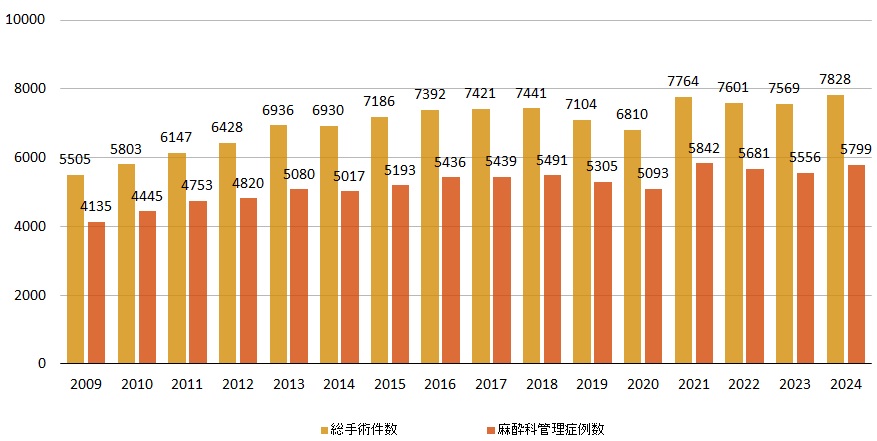 当院センター麻酔科の特徴は、心臓血管手術をはじめとして重症合併症を持つ患者の手術が非常に多いことであります。毎年増え続ける手術を安全に、また痛みストレスの少ないように日夜努力をしています。心臓外科以外にも、腹部手術、呼吸器外科、脳外科、産科、婦人科、泌尿器科をはじめとした大手術が多く、年間手術件数約8,000件のうち、約6,000件の手術を麻酔科で管理しています。
