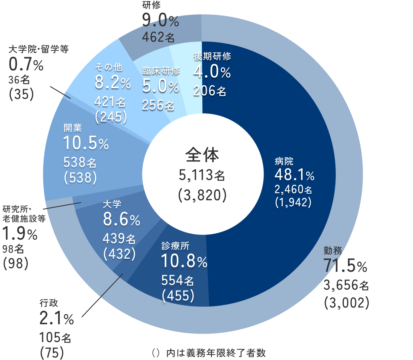義務年限を終了した3,820名の状況は、病院勤務者が1,942名(50.8%)、開業している者が538名(14.1%)、診療所勤務者が455名(11.9%)、大学勤務者が432名(11.3%)、研究所・老健施設等勤務者が98名(2.6%)などとなっています。