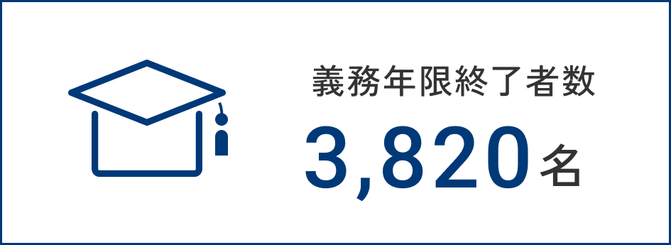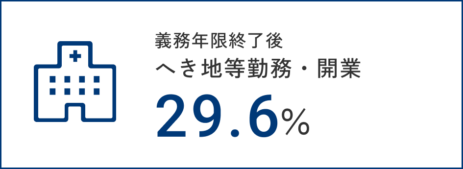 昭和62年度に初めて1期生が義務年限を終了して以来、本年度までに義務年限を終了した卒業生は39期生までの対象者3,871名のうち3,820名(98.7%)となりました。全卒業生に対する割合は74.7%です。対象者のうち未終了となっている者は、大学院に入学した者、育児休業や後期研修により義務年限外の取扱いがあった者等です。 ※義務年限終了者の約7割が出身都道府県内に残り、約3割が全国のへき地等に勤務しています。
