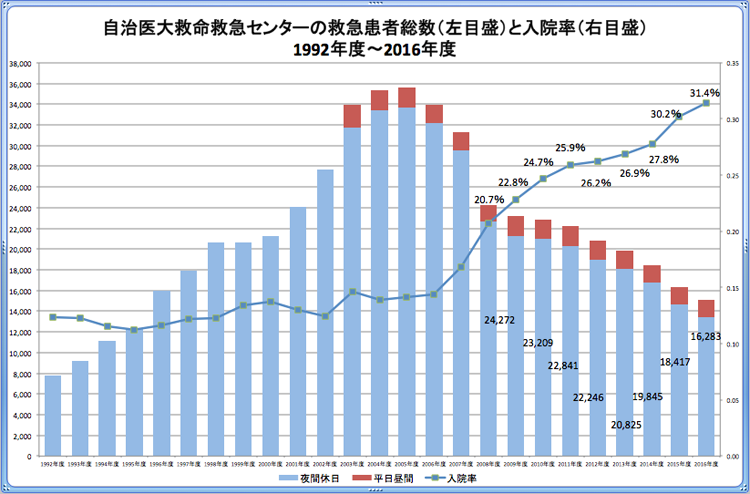一方で、周辺救急医療体制は医療資源不足が深刻で、夜間では初期救急医療もままなら無い状況であったため、自治医大救命救急センターが非常に多くの軽症救急を受入れざるを得ない状況であった。