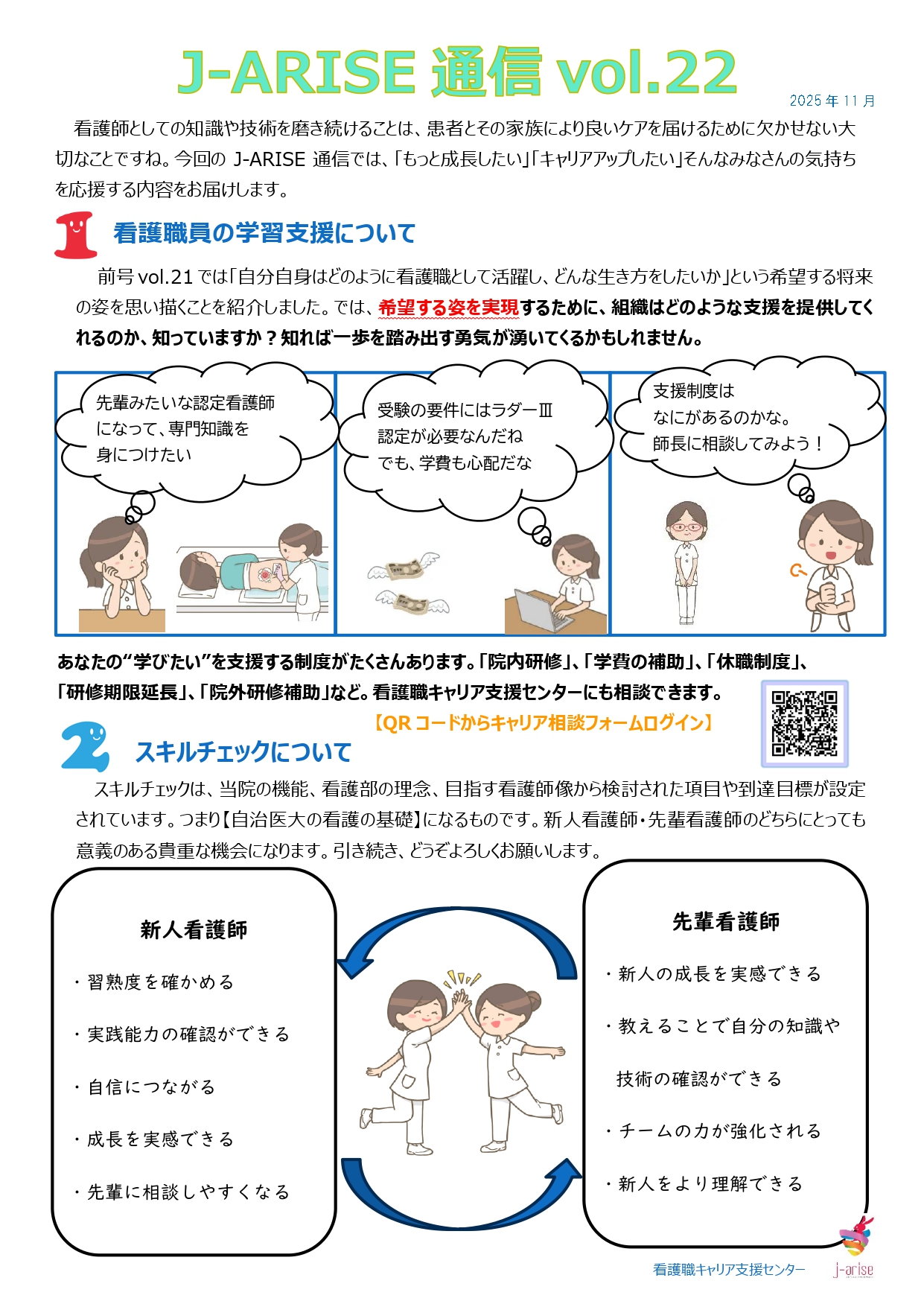 看護師としての知識や技術を磨き続けることは、患者とその家族により良いケアを届けるために欠かせない大切なことですね。今回のJ-ARISE通信では、「もっと成長したい」「キャリアアップしたい」そんなみなさんの気持ちを応援する内容をお届けします。