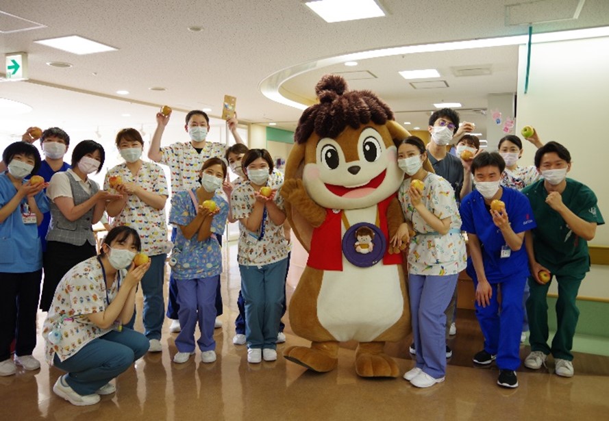 当日は外来や各病棟をピッピが訪れ、子どもたち一人ひとりや付き添いのご家族にリンゴをしっかり手渡してくださいました。元気いっぱいのピッピからリンゴを受け取った子どもたちは、みんな嬉しそうな様子で、センター内がとてもかわいい笑顔であふれておりました。