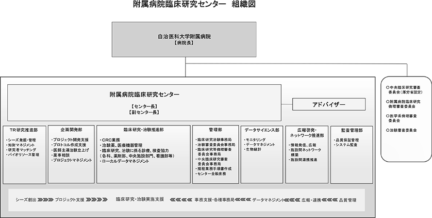 附属病院で行われる臨床研究や治験等が、高い倫理性及び科学的妥当性により、適切かつ円滑に実施されるよう、自治医科大学に設置していた臨床研究支援センターと附属病院臨床研究センターを統合し、2022年4月からは病院長の管轄のもと臨床研究センターにTR研究推進部、企画開発部、臨床研究・治験推進部、管理部、データサイエンス部、広報啓発・ネットワーク推進部、監査管理部の7つの部門が置かれ、医師、薬剤師、看護師及び事務職員を適切に配置し、橋渡し研究から臨床研究・治験まで、切れ目のない支援体制、円滑な実施体制を構築している。