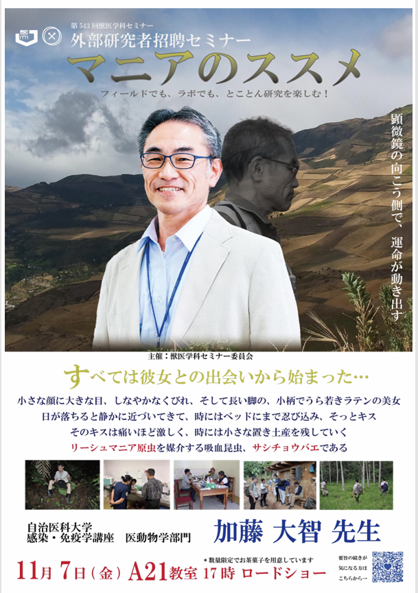November 07, 2025 The Seminor of Kitasato University school of veterinary medicine was held. Prof. Kato was a speaker. 北里大学獣医学部にて、第543回獣医学科セミナー 外部研究者招聘セミナーが開催されました。 加藤教授が「マニアのススメ フィールドでも、 ラボでも、とことん研究を楽しむ!」と題して 講演を行いました。 |