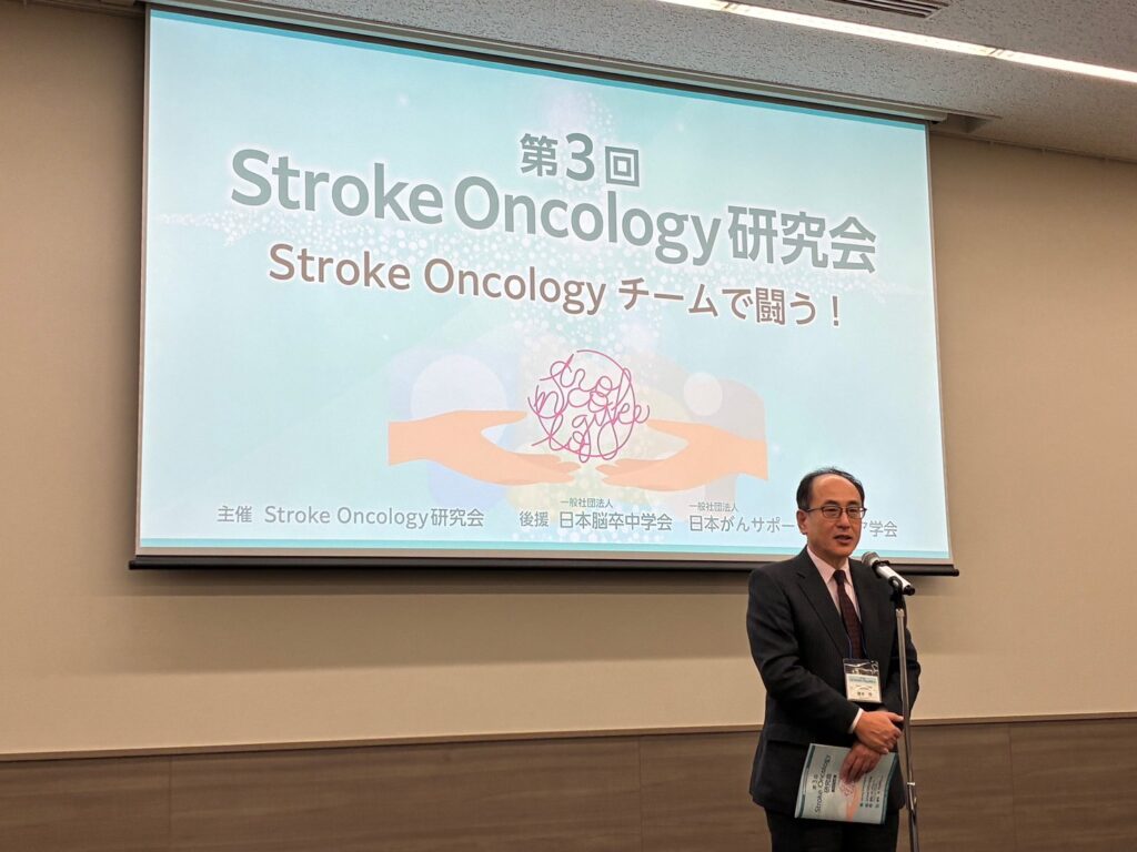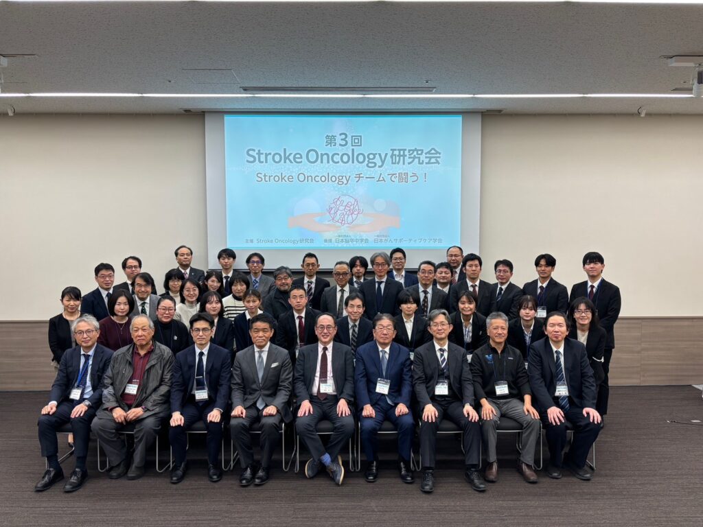 2025.12.22 学会関連について 第3回Stroke Oncology研究会を開催しました 藤本教授が当番世話人を務める第3回Stroke Oncology研究会が開催されました。がん診療医と脳卒中医のガチンコの研究会です。最新の情報共有出来る有意義な研究会でした。お手伝い頂いた自治医大医学部学生さん、医局員の皆さんどうも有り難うございました。 藤本教授による開催の挨拶 ご参加頂いた皆さんと集合写真 研究会の後の懇親会、皆さんお疲れ様でした! 前の記事へ お知らせ一覧へ