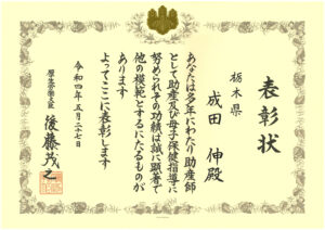 看護学部 成田 伸 教授が、令和4年度優良助産師厚生労働大臣表彰を受賞しました。 成田教授は昭和56年に助産師免許を取得し、高等教育機関で助産師教育に携わる一方、長年にわたり日本助産師会・栃木県助産師会、日本母性看護学会等の要職を務められ、様々な助産師活動支援や周産期医療の安全性の向上に尽力された功績が称えられました。 受賞された成田教授の更なるご活躍を祈念いたします。
