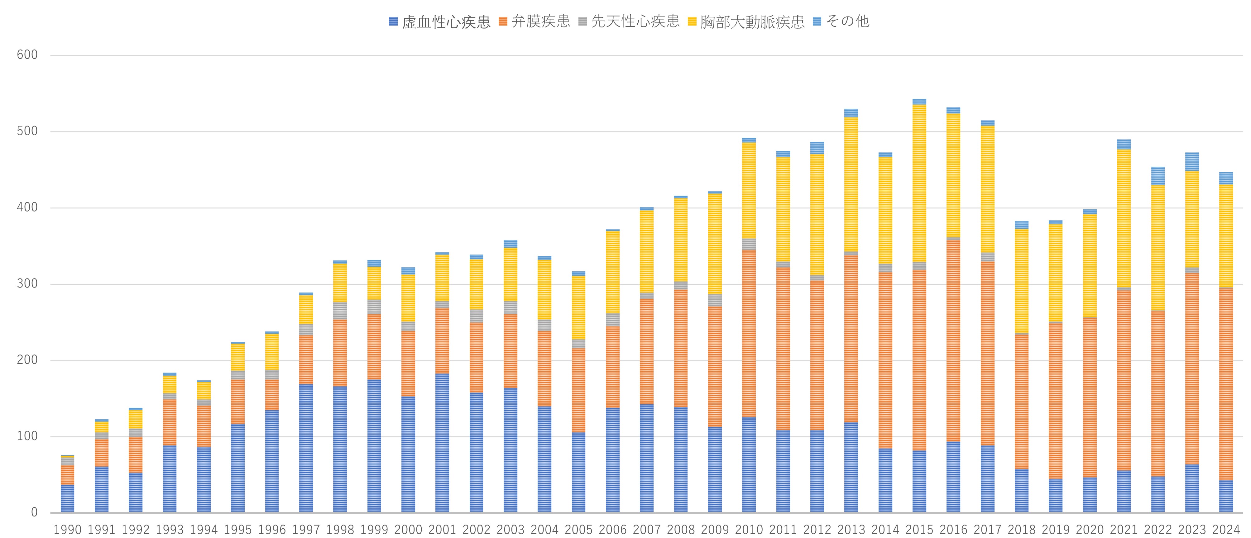 当センターで日本胸部外科学会に毎年報告している心臓大血管手術件数は、2024年の集計では447件でした。