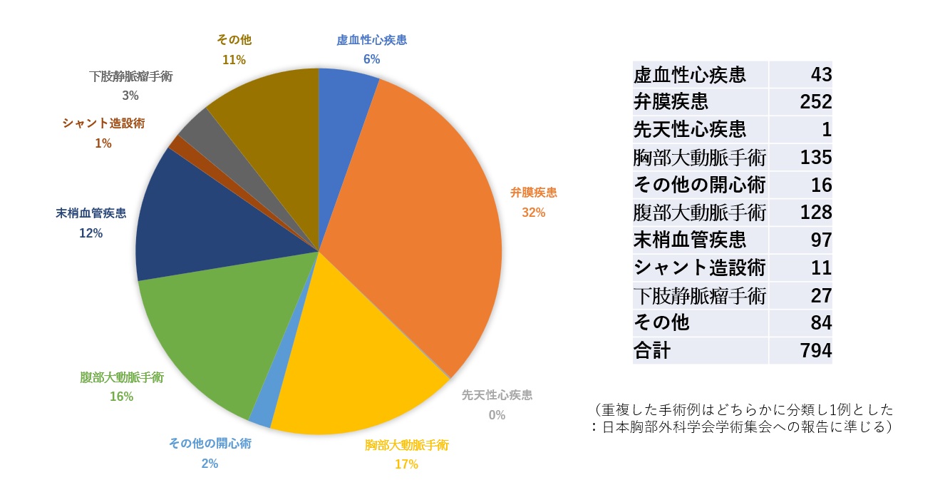 そして末梢血管等を含めた全手術件数は794件でした。診療実績の統計にありますように、心臓大血管手術の約半数が弁膜疾患であり、弁膜疾患における大動脈弁狭窄症の患者数の増加は驚異的です。