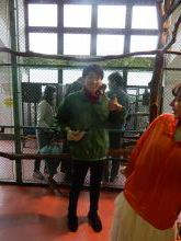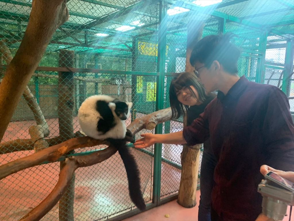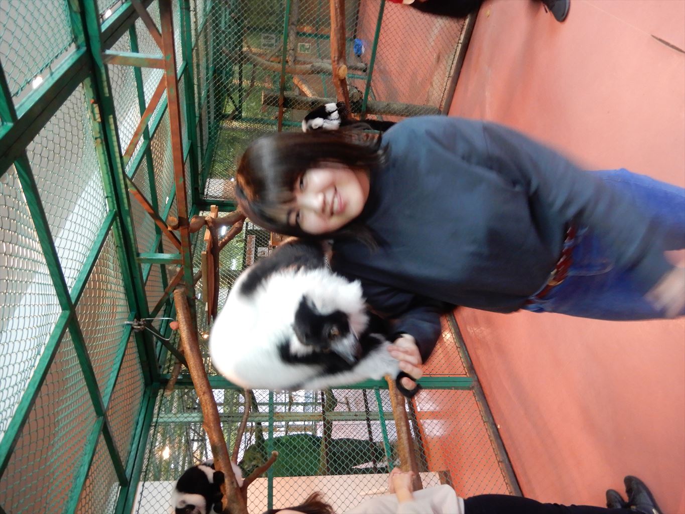 リスザルが頑張ってちゃんさーによじ登ろうとしてる |