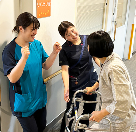 脳神経外科および整形外科を主な診療科とする病棟です。対象となる疾患は、脳血管障害や骨折など、急激に発症し身体的機能の障害を生じることが多くあります。高齢者だけでなく、骨腫瘍などがん化学療法や放射線治療を行う10~20代の若年層の患者さんもいます。身体面だけでなく、心のケアも大切です。病状や治療方法が十分に説明され、病気の治癒や苦痛の緩和、ADL・セルフケア能力を向上できるように、多職種と協働したリハビリテーション、誤嚥予防、口腔ケアに力を入れています。医師、リハビリスタッフ、医療相談員、退院支援室との合同カンファレンスを毎週実施して、早期離床、早期退院できるように個別性に応じた方法を検討します。また、闘病意欲を促進・維持できるように患者の思いを尊重した温かみのある看護を目指して日々奮闘しています。