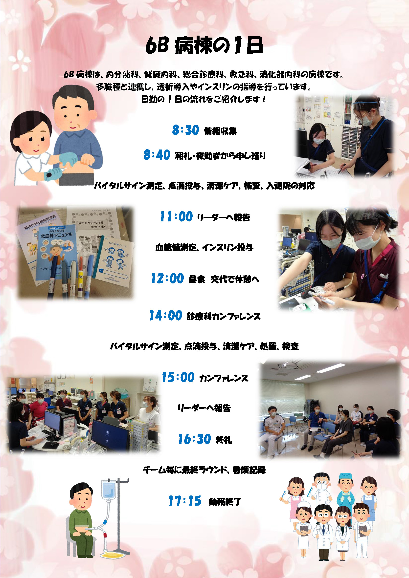 総合診療科・腎臓内科・内分泌代謝科・救急科の混合病棟ですが、総合内科としての機能があります。緊急で救急外来に来られた内科疾患の患者さんも多く入院します。緊急で入院された患者さんは、日常生活の援助を必要とし、支援者と同居していないことや介護認定されていない等があり、退院支援として多職種カンファレンスや地域の訪問看護師やケアマネージャーを含めたカンファレンスが必要なことがあります。また看護師は、腎臓内科の患者に対してはシャント造設・血液透析導入の患者指導、内分泌代謝科の患者に対してはインスリン導入・血糖測定の患者指導を実施しています。様々な疾患を患っているため、外科的な処置(全身麻酔による手術)や心臓カテーテル検査後の看護をすることもあります。