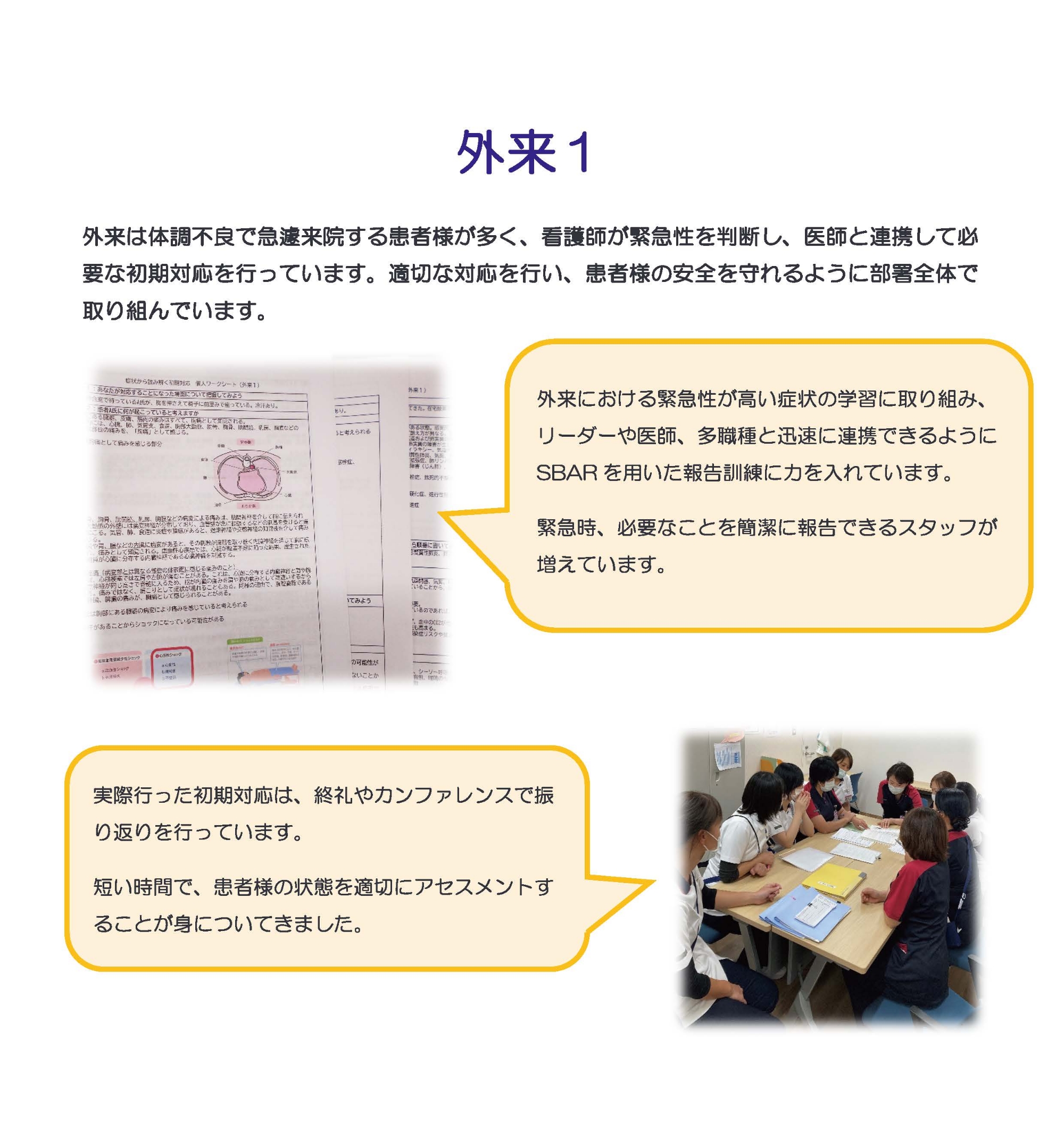 全ての診療科の処置を担う外来処置室と、専門性の高い9つの診療科の介助を担う専門外来に分かれています。処置室では、急な体調不良の対応から予約の点滴・注射や輸血、自己注射指導など幅広い患者様の対応を行っています。また、スクリーニングを実施し、多くの患者さんの中から個別的な介入が必要な方に早期から対応することに力を入れています。専門外来は産科、婦人科、泌尿器科、眼科、整形外科、形成外科、耳鼻咽喉・頭頸部外科、皮膚科、小児科で構成され、患者様が安全・安楽に検査・処置を受けられるように介助するとともに、病名告知や治療方針を説明する場に同席し、意思決定支援をすることにも力を入れています。処置室・専門外来ともに病棟や同じ外来間、入退院支援室等と連携を強化し、切れ目のない看護が実践できることを目指しています。