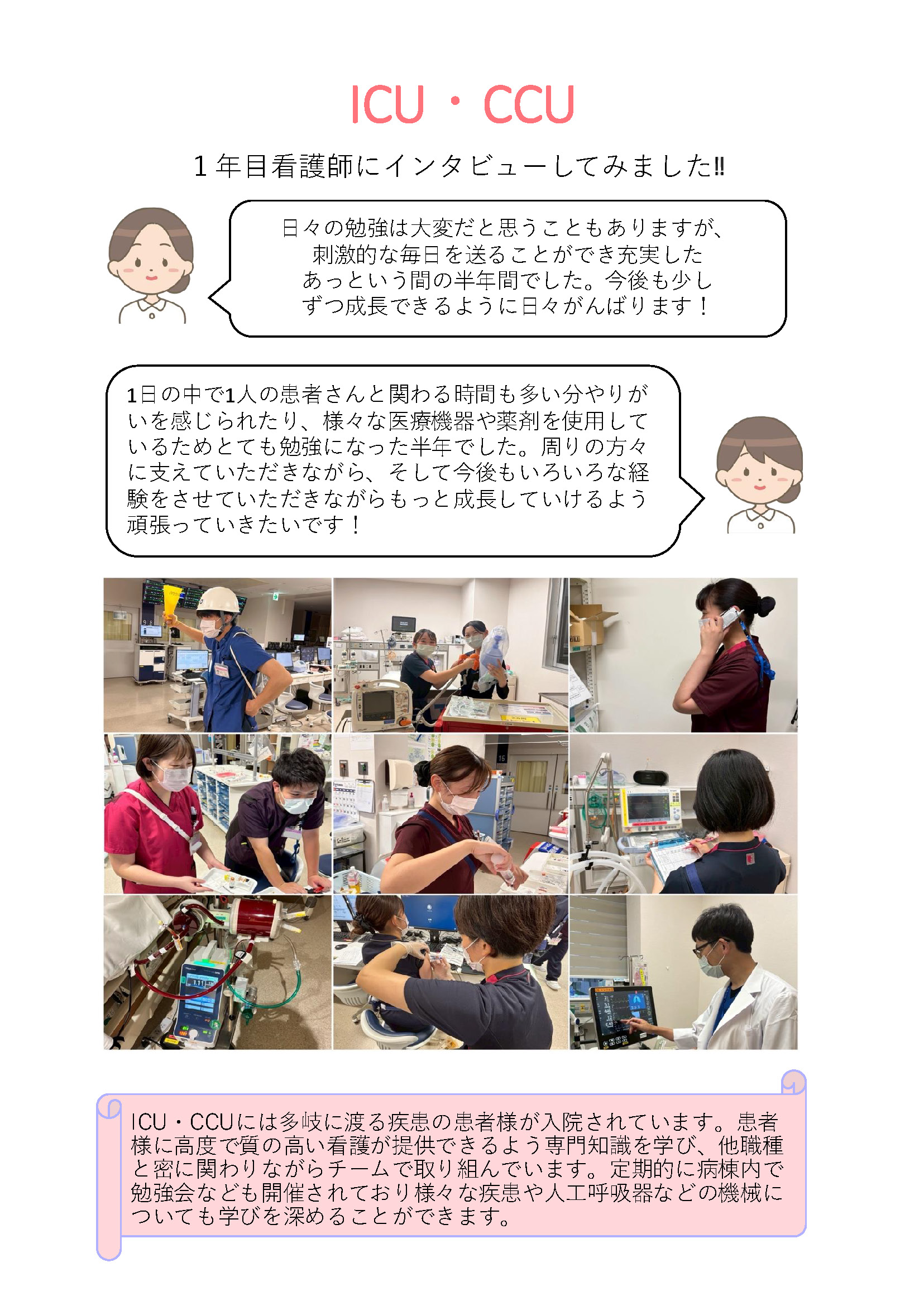 院内集中治療部30床のうち22床を有しており、専従の集中治療医、CCU医師と共に、院内外からの重症患者の受け入れをしています。対応する患者は、心臓血管外科術後や重症COVID-19患者に対するECMOの管理など多岐に渡ります。各診療科や専門的治療に携わるため、看護師は院内ラダーに加え、ICU・CCU教育プログラムに沿い集中治療について学びを深めます。メンバーシップからリーダーシップへとステップを踏み、医師、薬剤師、リハビリスタッフ、臨床工学技士、栄養士、臨床心理士、院内認定看護師などとのチーム医療の調整役を担います。また、部署内には集中治療認定看護師や特定行為看護師など専門課程を修了している看護師が複数在籍しています。各スタッフが連携し、高度な医療の提供かつ患者・家族の尊厳を守る治療を目指しています。