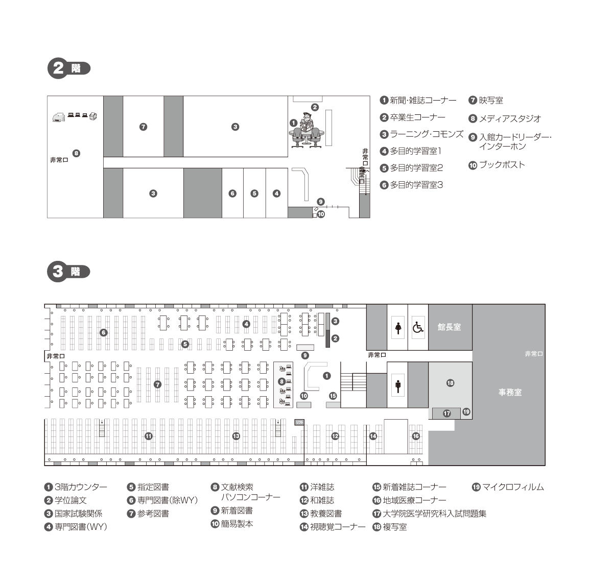 ・資料の配置は、館内の案内図をご覧になるか、図書館員におたずねください。